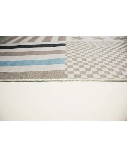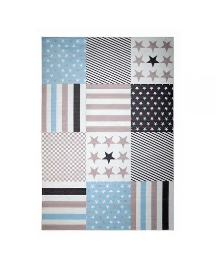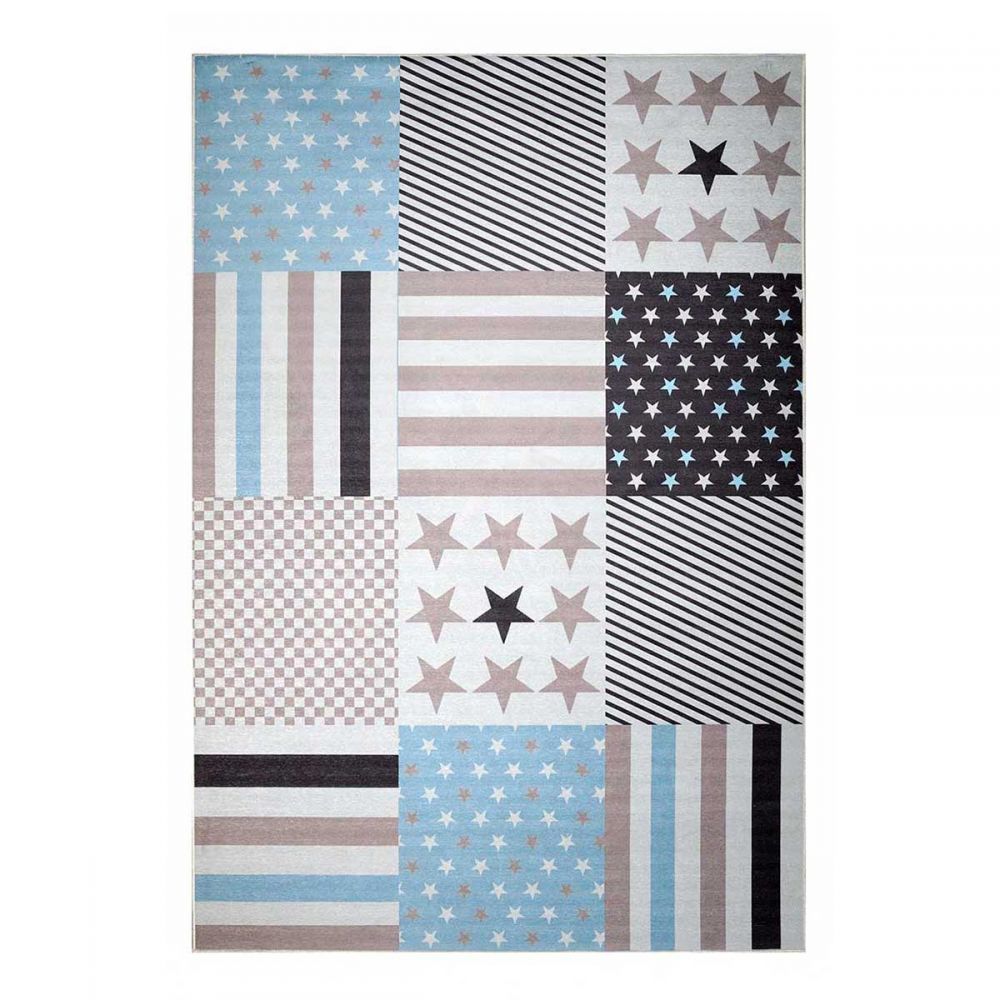 Χαλί μηχανής 4 εποχών από τη σειρά Astra της εταιρείας Tzikas Carpets με σχέδιο patchwork. Σε εκρού απόχρωση με γαλάζιες, μπεζ και γκρι λεπτομέρειες είναι ιδανικό για δωμάτιο αγοριού. Ανθεκτικό χαλί στην σκληρή καθημερινή καταπόνηση από το παιδικό παιχνίδι. Το εντυπωσιακό του σχέδιο είναι δημιουργημένο με την μέθοδο ψηφιακής εκτύπωσης που εγγυάται έντονα χρώματα και ανθεκτικότητα στον χρόνο. H επάνω επιφάνεια είναι κατασκευασμένη με ανεξίτηλα νήματα σύνθεσης 100% polyester in pile. Το υπόστρωμα είναι υφαντό και 100% βαμβακερής ποιότητας. Το βάρος του χαλιού είναι 1.400gsm. Είναι αντιστατικό άρα το σκούπισμα με ηλεκτρική σκούπα είναι εύκολο και αποτελεσματικό. Τα χαλιά της εταιρείας Tzikas Carpets είναι υποαλλεργικά και φιλικά προς την υγεία και το περιβάλλον.