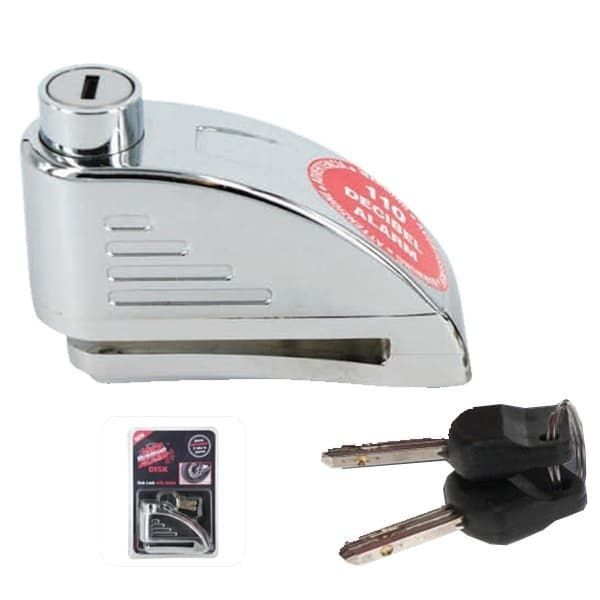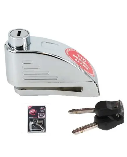 Προστατέψτε έξυπνα και αποτελεσματικά τη μοτοσικλέτα σας με την κλειδαριά δισκόφρενου LOCK ALARM DISK με συναγερμό. Αποτελείται από πολύ σκληρό υλικό, κύλινδρο κλειδαριάς από ειδικά επεξεργασμένο ατσάλι διαμέτρου 7mm και είναι παντός καιρού. Η κλειδαριά τοποθετείται στο δισκόφρενο και διαθέτει αισθητήρες κίνησης καθώς και κραδασμών οι οποίοι ενεργοποιούν τον πολύ δυνατό συναγερμό των 110 decibel και εξασφαλίζουν έτσι υψηλή προστασία σε όλες τις μεθόδους διάρρηξης. Υπάρχει δυνατότητα επιλογής χρήσης του ή όχι και επίσης διαθέτει Tamper στο καπάκι της θήκης των μπαταριών έτσι ώστε να δίνει συναγερμό σε περίπτωση παραβίασής της, εάν κάποιος προσπαθήσει να αφαιρέσει τις μπαταρίες.