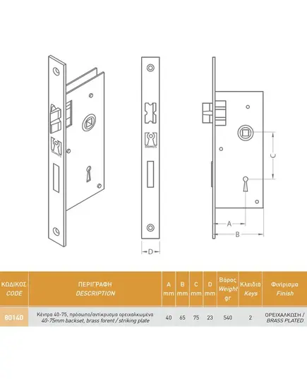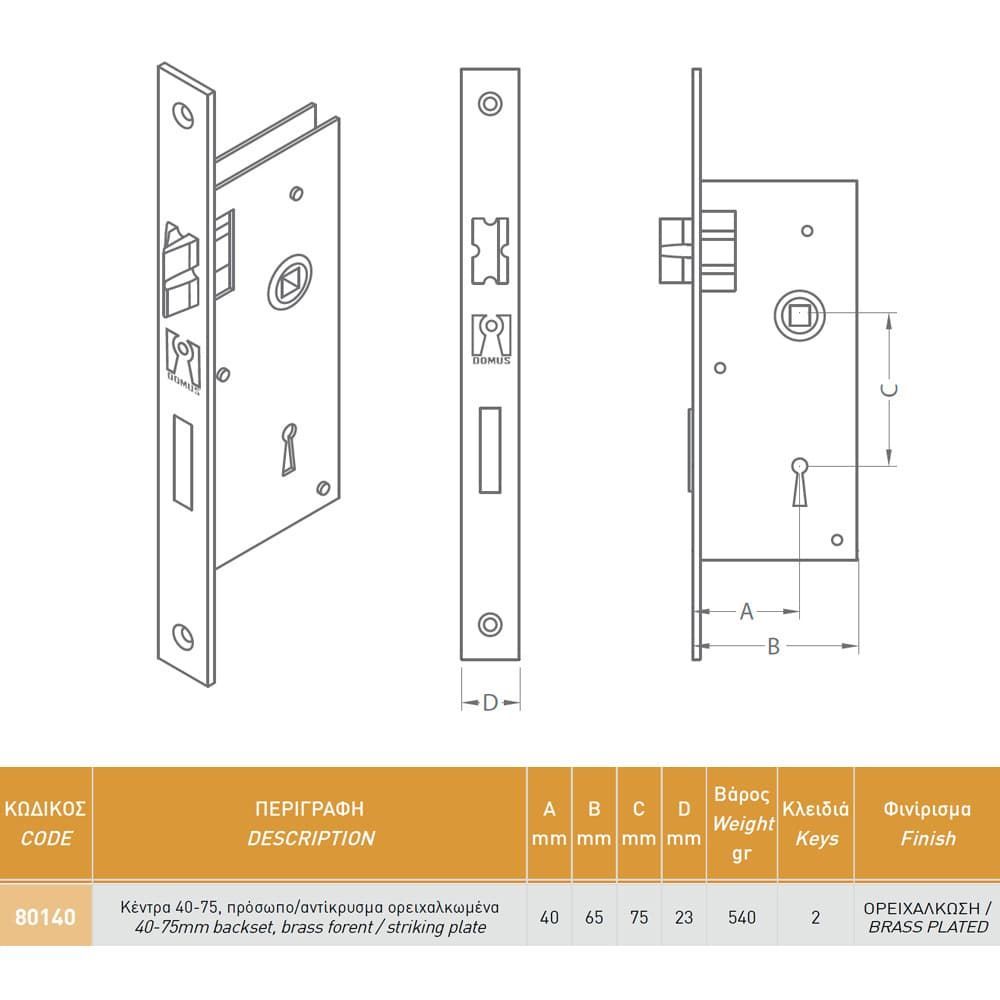 Κλειδαριά καμαρόπορτας χωνευτή με τετράγωνη πατούρα Χρυσό 75-40 DOMUS 80140