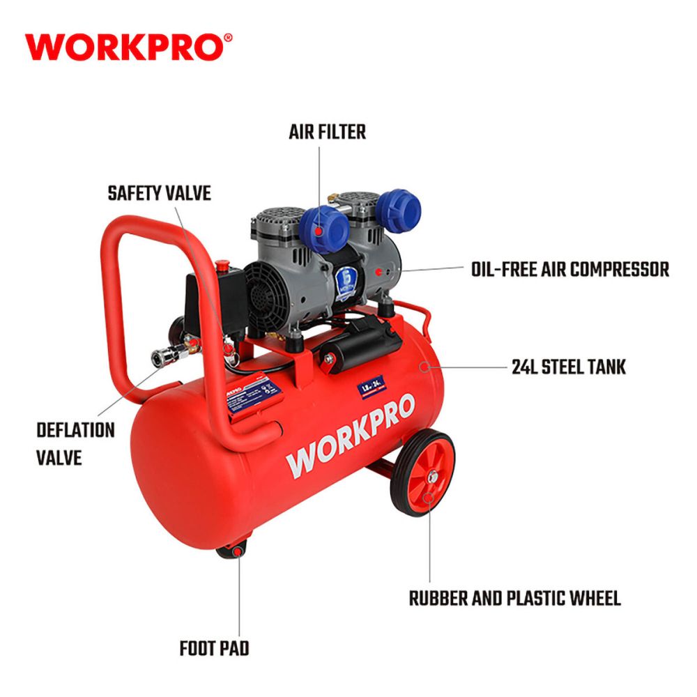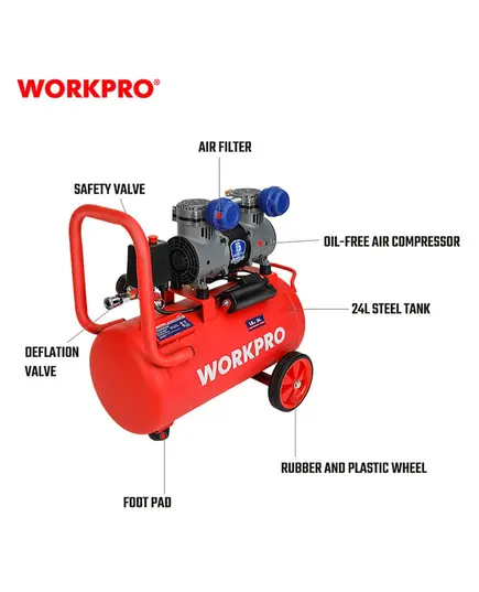 Αεροσυμπιεστής WORKPRO χαμηλού θορύβου 24 λίτρα 800Watt WP425001