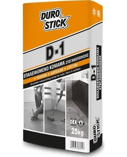 Επαλειφόμενο, τσιμεντοειδές, στεγανοποιητικό κονίαμα που παρουσιάζει άριστη πρόσφυση, στεγανοποιεί πλήρως τις επιφάνειες, χάρη στα πολυμερή και υδαταπωθητικά συστατικά που περιέχει. Το D-1 της DUROSTICK είναι κατάλληλο για θετικές (εξωτερική εφαρμογή, προληπτικά) και αρνητικές (εσωτερική εφαρμογή, για επισκευή) υδροστατικές πιέσεις. Αντέχει στον παγετό και είναι υδρατμοδιαπερατό (διαπνέει).