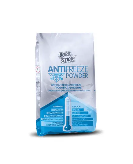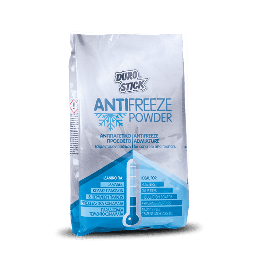 Επιταχυντής σκλήρυνσης σε μορφή πούδρας που προστίθεται σε τυποποιημένα ή παραδοσιακά τσιμεντοκονιάματα, επιταχύνοντας την ανάπτυξη των μηχανικών αντοχών σε χαμηλές θερμοκρασίες. Οι εφαρμογές των κονιαμάτων πρέπει να γίνονται σε θερμοκρασίες μεγαλύτερες των +5°C. Έχει αποδειχθεί πως εάν η θερμοκρασία μειωθεί κάτω από τους +5°C και η πήξη δεν έχει ολοκληρωθεί, τότε το τσιμεντοκονίαμα αποδομείται και καταστρέφεται. Το ANTIFREEZE POWDER επιταχύνει την ενεργοποίηση του τσιμέντου που εμπεριέχεται στα τσιμεντοκονιάματα, βοηθά την γρήγορη ενυδάτωσή του, μειώνει τον χρόνο πήξης και σκλήρυνσής του, αποτρέποντας την παγοπληξία κατά τη διάρκεια της ωρίμανσής τους. Η προσθήκη του ANTIFREEZE POWDER σε κάθε σακί 25kg αποτρέπει τεχνικές αστοχίες λόγω θερμοκρασιακών μεταβολών.