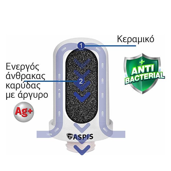 Τεχνολογία φίλτρανσης 2 σταδίων με ενεργό άνθρακα φλοιού καρύδας εμποτισμένο με άργυρο για αντιβακτηριδιακή δράση. Κεραμικό πλενόμενο φίλτρο για μέγιστη διάρκεια ζωής. Απομακρύνει τα ιζήματα (χώμα, λάσπη, σκουριά), αφαιρεί χλώριο, φυτοφάρμακα, ζιζανιοκτόνα και οργανικές ουσίες. Εύκολο στη τοποθέτησή του. Διάρκεια ζωής φίλτρου 750lt ή 3 μήνες. Κατάλληλο για τη συσκευή S-02.