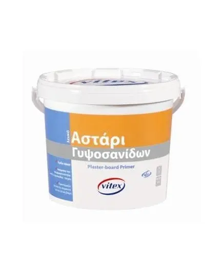 Αστάρι Γυψοσανίδων: Το ΑΣΤΑΡΙ ΓΥΨΟΣΑΝΙΔΩΝ της VITEX είναι υδατοδιαλυτό ακρυλικό αστάρι εσωτερικής χρήσης, με άριστη γεμιστική ικανότητα για επιφάνειες από γυψοσανίδα, μπετόν, σπατουλαρισμένες κ.α. Λόγω της υψηλής γεμιστικής ικανότητας του προϊόντος, εξομειώνεται η απορροφητικότητα μεταξύ του χαρτιού της γυψοσανίδας, του υλικού αρμολόγησης και των υπολοίπων προς βαφή επιφανειών. Επιπροσθέτως, καλύπτονται πλήρως τυχόν ανομοιομορφίες του χαρτιού της γυψοσανίδας. Μπορεί επίσης να χρησιμοποιηθεί και σε άλλες εσωτερικές επιφάνειες, που δεν απαιτούν κάποιο διεισδυτικό, σταθεροποιητικό και υδροαπωθητικό αστάρι υψηλών απαιτήσεων. Η τελική βαφή επιφανειών ασταρωμένων με ΑΣΤΑΡΙ ΓΥΨΟΣΑΝΙΔΑΣ της VITEX, με οποιοδήποτε διακοσμητικό χρώμα νερού, οδηγεί σε ένα άψογο και ομοιόμορφο φινίρισμα, από την πρώτη κιόλας επίστρωση.