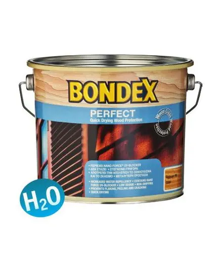Το Bondex Perfect Wood Protection αναδεικνύει το ξύλο δίνοντας ένα διάφανο σατινέ τελείωμα που αφήνει τα νερά του ξύλου να φανούν. Είναι βερνίκι νερού θιξοτροπικό (δε στάζει), μυρίζει ελάχιστα, είναι εύκολο στην εφαρμογή του και εισχωρεί βαθιά στο ξύλο. Η τεχνολογία βραδείας αποδέσμευσης απελευθερώνει τα ενεργά συστατικά του μόνο όταν χρειάζεται, κάνοντας το περισσότερο ανθεκτικό.
