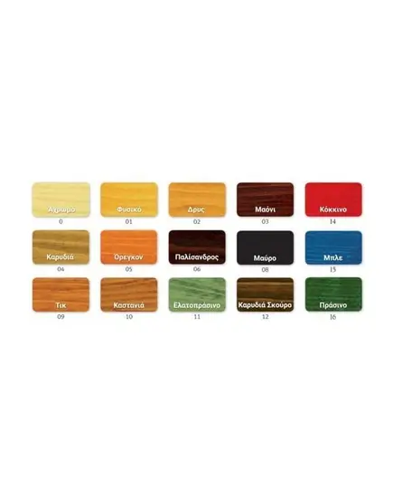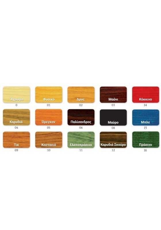 0 Άχρωμο, 01 Φυσικό, 02 Δρυς, 03 Μαόνι, 04 Καρυδιά, 05 Όρεγκον, 06 Παλίσανδρος, 09 Τικ, 10 Καστανιά, 11 Ελατοπράσινο, 12 Καρυδιά Σκούρη, 20 Ανοικτό Γκρι, 21 Μπεζ Χρυσό, 22 Ασημί Σκούρο, 23 Γκρι Σκούρο και διατίθενται σε δοχεία των 0,75L των 2,5L των 5,0L και των 25,0L.
