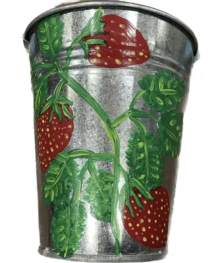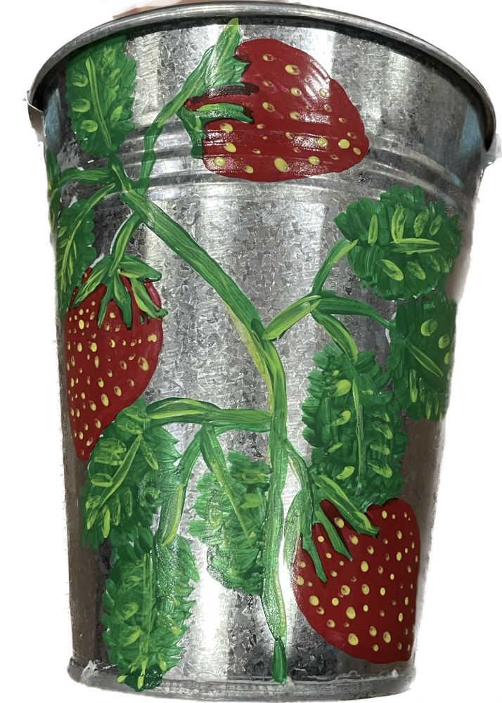 Διακοσμητικός μεταλλικός κουβάς ηλεκτροστατικά λευκός με ύψος 17 εκατοστά, βάση Φ10 και χείλος Φ15 "Φραουλιά"