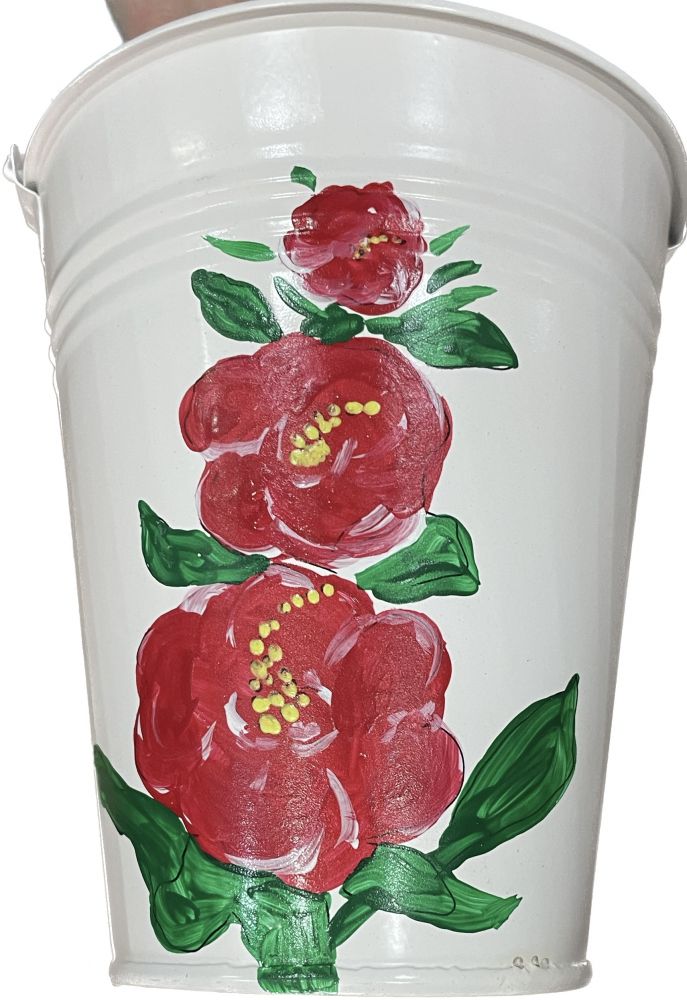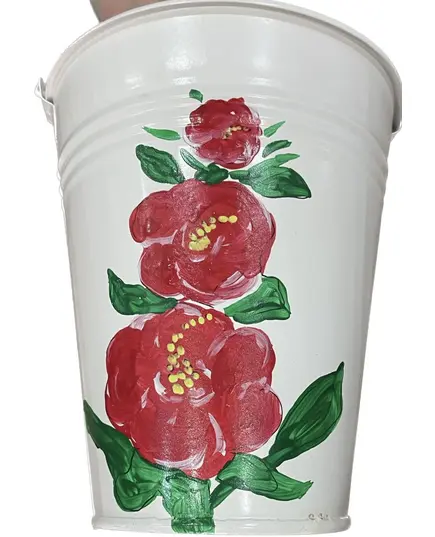 Διακοσμητικός μεταλλικός κουβάς ηλεκτροστατικά λευκός με ύψος 17 εκατοστά, βάση Φ10 και χείλος Φ15 "Λουλούδι κόκκινο"