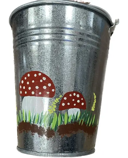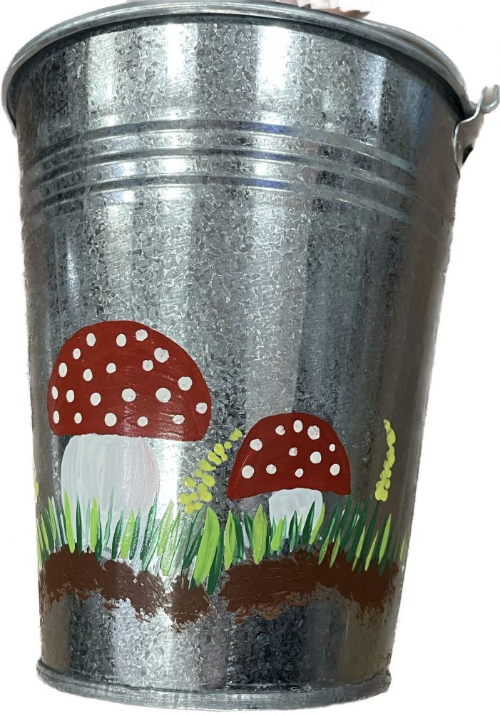 Διακοσμητικός μεταλλικός κουβάς ηλεκτροστατικά λευκός με ύψος 17 εκατοστά, βάση Φ10 και χείλος Φ15 "Μανιτάρια"
