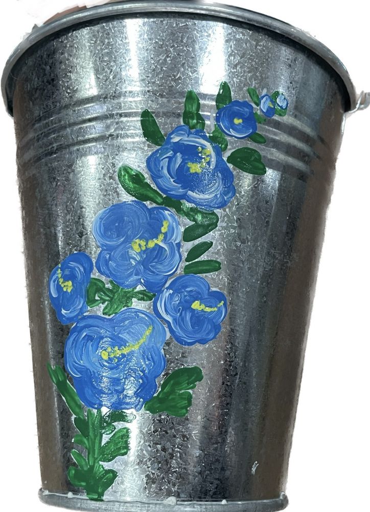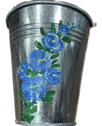 Διακοσμητικός μεταλλικός κουβάς ηλεκτροστατικά λευκός με ύψος 17 εκατοστά, βάση Φ10 και χείλος Φ15 "Λουλούδι μπλε"