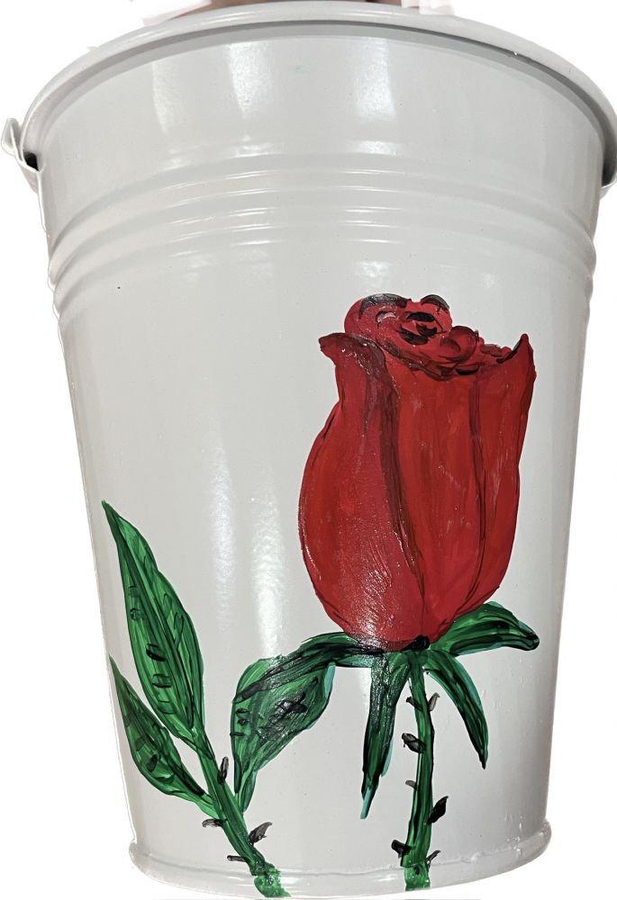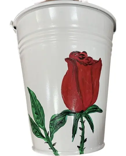 Διακοσμητικός μεταλλικός κουβάς ηλεκτροστατικά λευκός με ύψος 17 εκατοστά, βάση Φ10 και χείλος Φ15 "Τριαντάφυλλο"