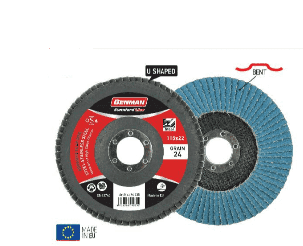 Δίσκος φτερωτός με κούρμπα Benman Maxpower. Ιδανικός για μέταλλα και ανοξείδωτα (ξεχόνδρισμα, αφαίρεση). Εξωτερική διάμετρος 115mm και 125mm. Με λειαντικό Ceramic sk 865 k (τεχνητό διαμάντι) της VSM.
