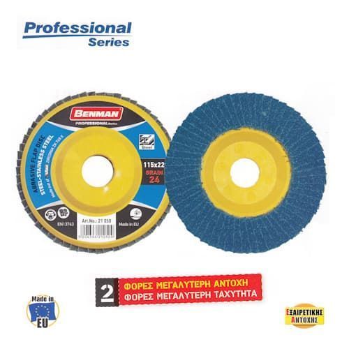 Δίσκος φτερωτός ίσιος με πλαστική βάση Benman Professional. Ιδανικός για μέταλλα και ανοξείδωτα (ξεχόνδρισμα, αφαίρεση). Εξωτερική διάμετρος 115mm. Με λειαντικό Zirconia Alumina (τεχνητό διαμάντι) της VSM.