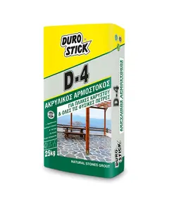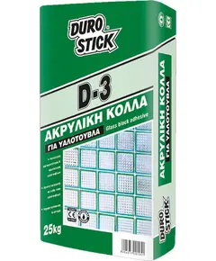 Προδιαγραφές Ακρυλική, τσιμεντοειδής, λευκή κόλλα υψηλών απαιτήσεων, κατάλληλη για τη συγκόλληση και αρμολόγηση υαλότουβλων. Έχει ισχυρή πρόσφυση, υψηλή αντοχή, "δεν τρέχει" και αντιστέκεται στην υγρασία και τον παγετό. Η κόλλα DUROSTICK D-3 εφαρμόζεται εύκολα σε κάθε τύπο υαλότουβλων,...