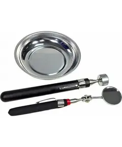 Horusdy σετ εργαλείων επιθεώρησης συλλογής αντικειμένων με Ιnox πιατάκι SDY-97819 Σετ 3 τεμαχίων που περιλαμβάνει: Ανοξείδωτο (Inox) μαγνητικό πιατάκι 11cm Καθρεπτάκι επιθεώρησης με αντιολισθητική λαβή και πλάτος 2cm Κεραία τηλεσκοπική μαγνητική συλλογής αντικειμένων βάρους έως 1kg
