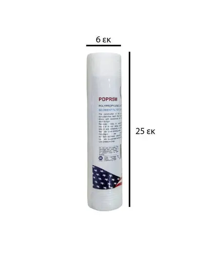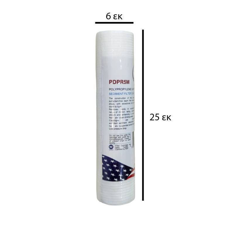 PDPR5M φίλτρο υψηλής ποιότητας στερεών σωματιδίων 10" από ίνες πολυπροπυλενίου της Puredry (USA).Αφαιρεί χώμα, άμμο, λάσπη, σκουριά, ιζήματα, μικροσωματίδια και αιωρούμενα στερεά έως 5 micron. Ιδανικό φίλτρο στερεών για όλα τα συστήματα φίλτρανσης και τις μονάδες αντίστροφης όσμωσης. Προστατέψτε την υδραυλική εγκατάσταση και τις συσκευές σας, τοποθετώντας ένα φίλτρο προλυπροπυλενίου δίπλα στο υδρόμετρο. Με αυτό τον τρόπο προστατεύετε όλη την εγκατάσταση από φθορές σε βρύσες, καζανάκια, καφετιέρες, φλοτέρ κτλ. Η διάρκεια ζωής του κυμαίνεται από 3 έως 12 μήνες, εξαρτάται από την ποιότητα του νερού. θα πρέπει να ελέγχετε σε τακτά χρονικά διαστήματα, γι' αυτό συνήθως τοποθετείται σε διάφανη φιλτροθήκη. Η θερμοκρασία λειτουργίας είναι: 2°C – 80°C.