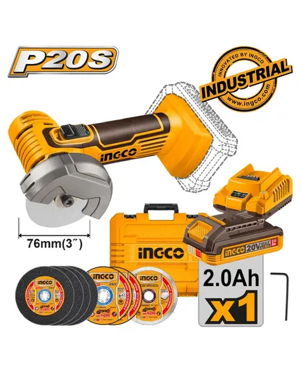 Γωνιακός Τροχός Μπαταρίας mini 76mm 20V +1x2.0Ah Li-Ion New CAGLI76012E INGCO