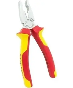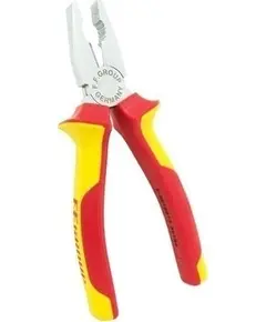 ΠΕΡΙΓΡΑΦΗ Πένσα ηλεκτρολόγων 1000V με υπομόχλιο που αυξάνει τη δύναμη κατα 50%. Με επιφάνειες σύσφιξης για πλακέ και στρογγυλά αντικείμενα. Διαθέτει λαβές μονωμένες με επένδυση δύο υλικών, ελεγμένες κατά VDE. Κατασκευασμένη απο μολυβδένιο-χρωμοβαναδιούχο χάλυβα υψηλής ποιότητας.