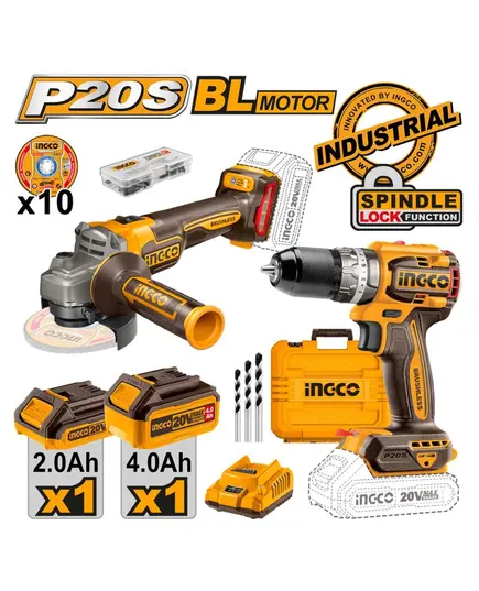 Ingco CKLI20273E Σετ Γωνιακός Τροχός & Δραπανοκατσάβιδο Brushless 20V με 2 Μπαταρίες 4Ah - 2Ah και Θήκη