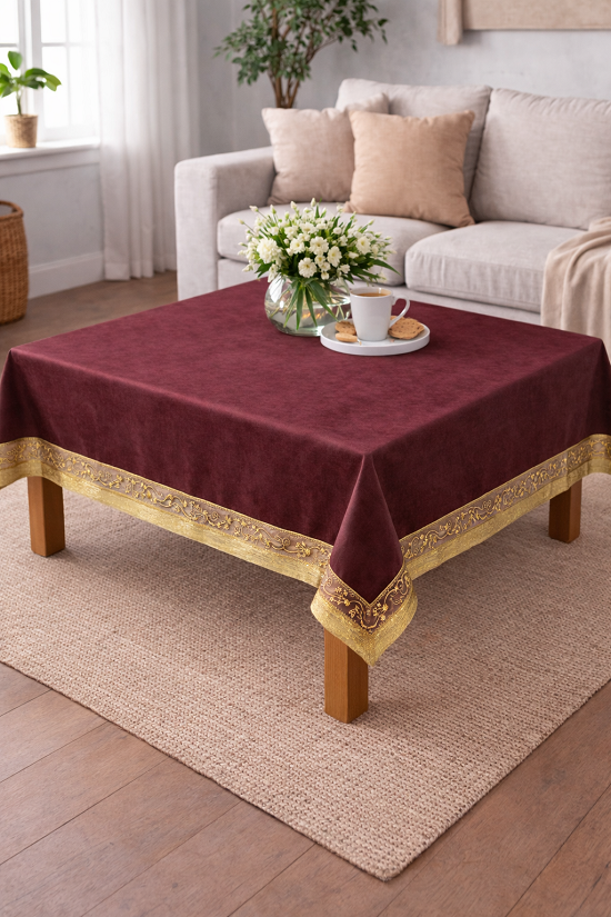 Το καρέ τραπεζομάντηλο με χρυσή φάσα, κέντημα και χάντρες - προσφέρει κομψότητα και ζεστασιά σε οποιονδήποτε χώρο.