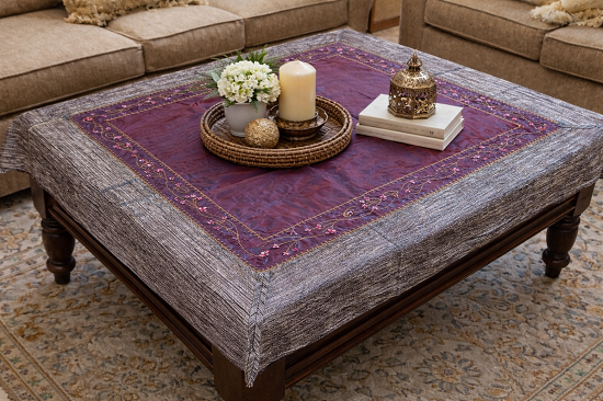Το καρέ τραπεζομάντηλο με ασημί φάσα, κέντημα και χάντρες - προσφέρει κομψότητα και ζεστασιά σε οποιονδήποτε χώρο.