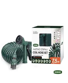 Λάστιχο ποτίσματος Σπιράλ της εταιρίας Grasher που τυλίγεται πίσω αυτόματα χάρη στη δύναμη επαναφοράς του. Είναι εύκολο στη χρήση καθώς δεν μπλέκεται σε κόμπους. Διαθέτει 7 θέσεις ποτίσματος και ταχυσύνδεσμο για βρύση. Σετ λάστιχο ποτίσματος 15 μέτρων με πιστόλι εκτόξευσης και 2...