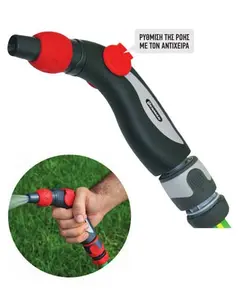 Ρυθμιζόμενο πιστόλι νερού Επιτρέπει το πότισμα με διαφορετικά ρεύματα νερού. Εξοπλισμένο με μοχλό για ρύθμιση της ροής του νερού.