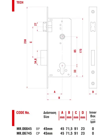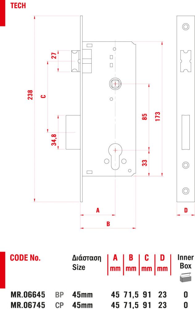 Κλειδαριά ξυλόπορτας εισόδου 45αρα (χωρίς κύλινδρο) ορείχαλκος/χρυσό MARTIN 06645