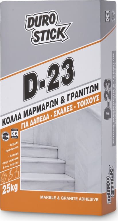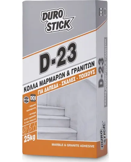 Η DUROSTICK D-23 είναι κατάλληλη για επιστρώσεις μαρμάρων και γρανιτών σε τοίχους και δάπεδα, τόσο σε εσωτερικούς όσο και σε εξωτερικούς χώρους. Είναι ιδανική για επενδύσεις σκαπιτσαριστών μαρμάρων σε καλύψεις όψεων. Παρέχει άριστη συγκόλληση σε κανονικές και ακανόνιστες πλάκες δαπέδων που υπόκεινται σε ιδιαίτερη καταπόνηση.