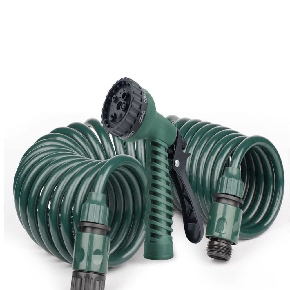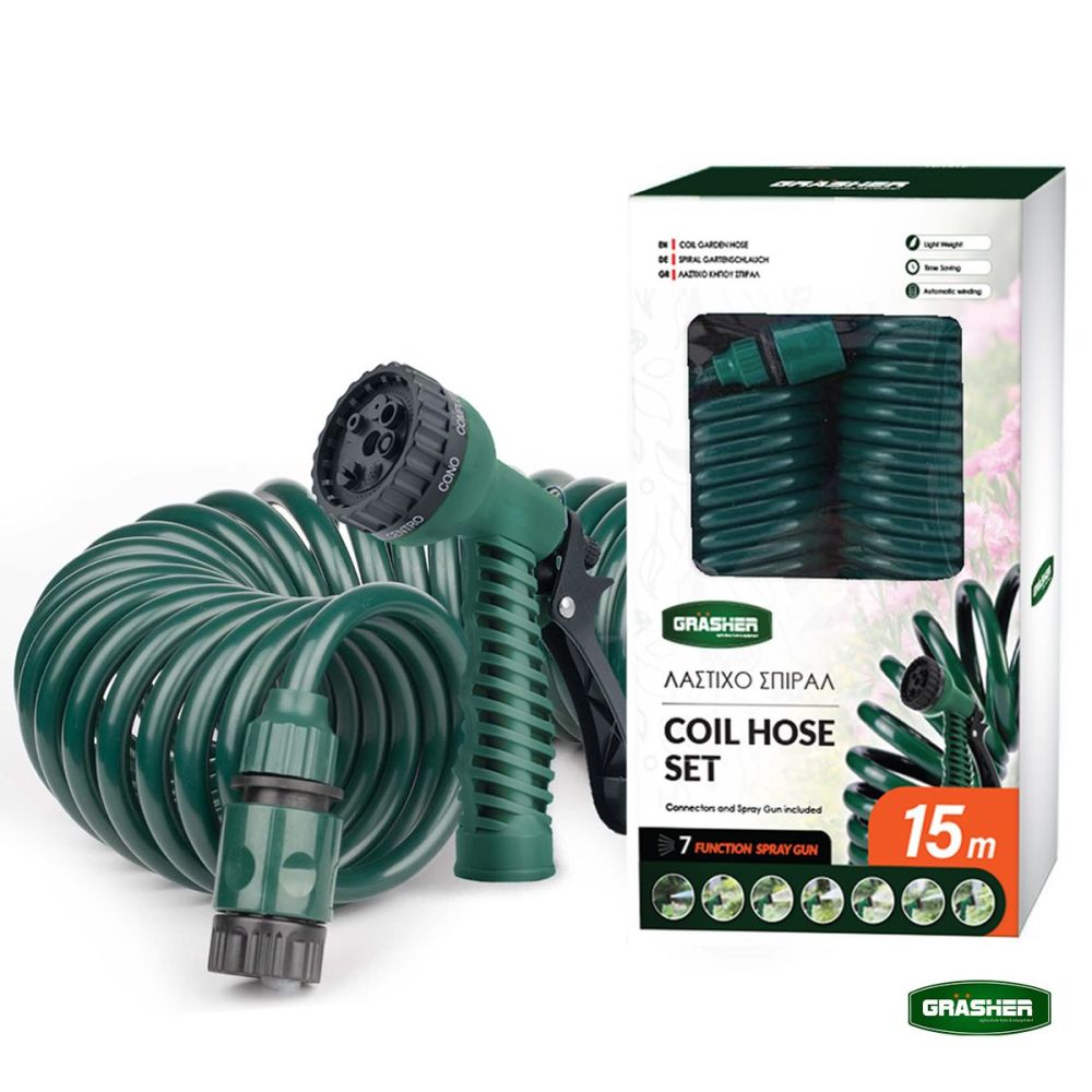 Λάστιχο ποτίσματος Σπιράλ της εταιρίας Grasher που τυλίγεται πίσω αυτόματα χάρη στη δύναμη επαναφοράς του.