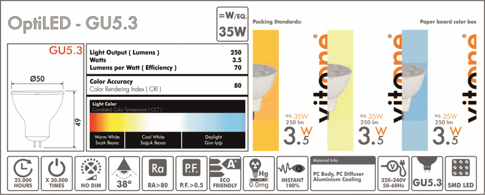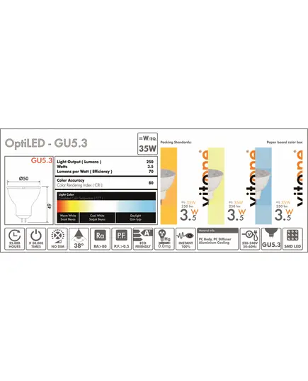 Led MR16 GU5.3 VitoOne 240V 6400K (Λευκό χρώμα)