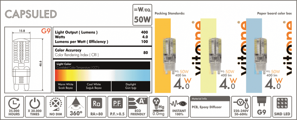 Led G9 Vitoone 220V 4W 2700K (Κίτρινο χρώμα)