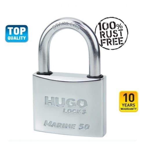 HUGO LOCKS MARINE λουκέτο INOX για ναυτική χρήση, με 3 κλειδιά. μασίφ ορειχάλκινο σώμα με ειδική επινικέλωση για έξτρα δύναμη και αντοχή κατά της Διάβρωσης. 5 πειράκια για έξτρα αντοχή από εργαλεία διάρρηξης. Ελατήριο από ατσάλι. Διπλό ισχυρό κλείδωμα για υψηλή αντοχή στο τρύπημα και στο βίαιο τράβηγμα. Ειδικές τσιμούχες αδιαβροχοποίησης. Γάντζος από ανοξείδωτο ατσάλι.10 Χρόνια Εγγύηση