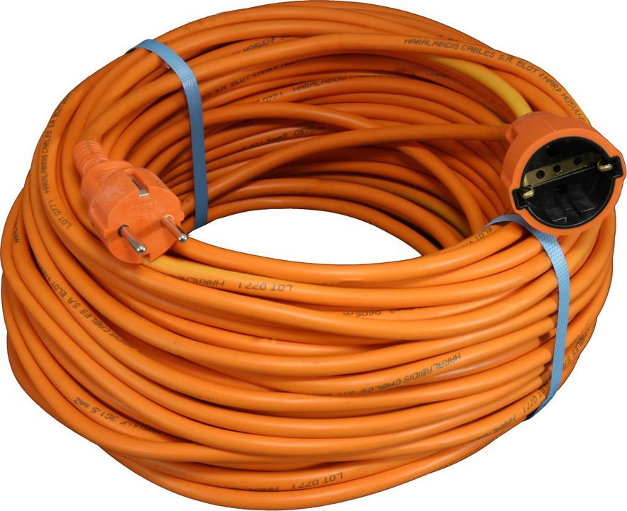 Προέκταση καλωδίου της Χαραλαμπίδης, μήκους 33 μέτρων, σε πορτοκαλί χρώμα. Το καλώδιο έχει διατομή 1.5mm² που σημαίνει πως η μέγιστη κατανάλωση των συνδεδεμένων συσκευών δεν θα πρέπει να υπερβαίνει τα 3600W που ισοδυναμούν, για παράδειγμα, με την ισχύ που απαιτεί ένα στεγνωτήριο ρούχων για να λειτουργήσει.