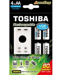 Τύπος συσκευής Φορτιστής μπαταριών Τύπος μπαταρίας φόρτισης AA, AAA Τάση 1.2 V Αριθμός μπαταριών που περιλαμβάνονται 4 AA Χωρητικότητα 2000 mAh l Περιλαμβάνει 4x Toshiba Rechargeable AA 2000mAh Batteries, 1x USB Charger Αριθμός κατασκευαστή...