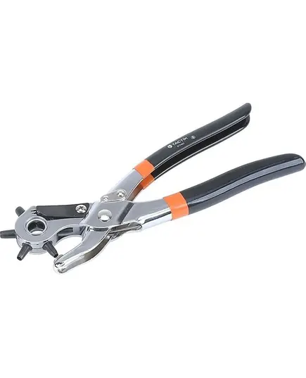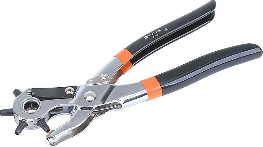Διαθέτει μακριές εύχρηστες λαβές, μονωμένες με επένδυση ειδικού αντιολισθητικού ελαστικού που προσφέρουν καλύτερο κράτημα και ακρίβεια χειρισμού. Το πλέον κατάλληλο και πρακτικό εργαλείο, για εργασίες τρυπήματος σε δέρματα, υφάσματα και πλαστικά, με 1επιλογής έξι διαφορετικών μεγεθών τρύπας: Ø2.5, 3, 3.5, 4, 4.5 και 5mm.