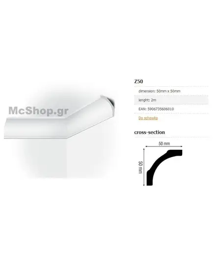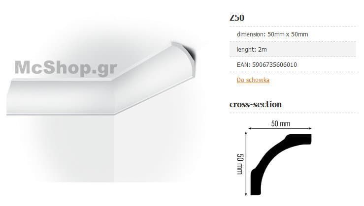 Πολυστερίνη κορνίζα απομίμηση γύψινου μήκους 2 μετρών 50χ50 χιλιοστών Z50