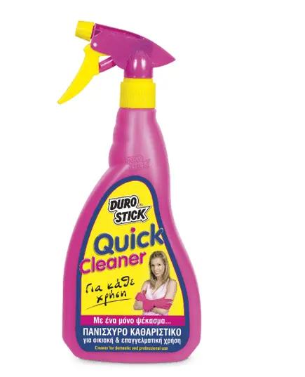 Δραστικό καθαριστικό υγρό, χαμηλού αφρισμού, που αφαιρεί με ένα ψέκασμα, χωρίς τρίψιμο, σε ελάχιστο χρόνο, σκληρή βρωμιά, ξεραμένα ή καμένα λίπη. Παρουσιάζει υψηλή καθαριστική δράση χωρίς να καταστρέφει τις επιφάνειες όπου εφαρμόζεται. Το DUROSTICK QUICK CLEANER είναι κατάλληλο για καθαρισμό τόσο για οικιακή όσο και για επαγγελματική χρή-