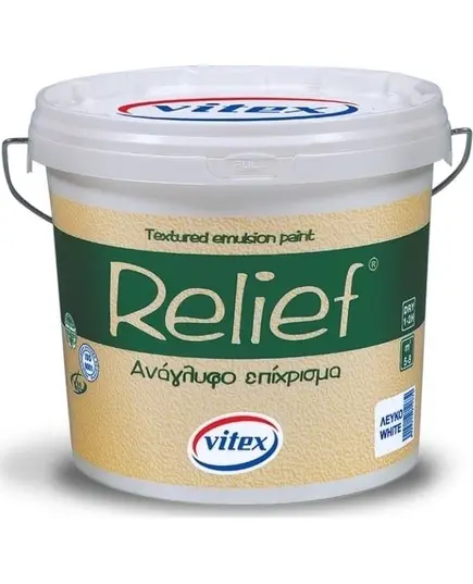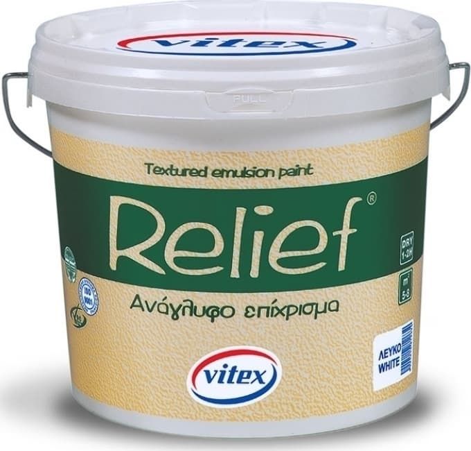 Ανάγλυφο πλαστικό χρώμα εξωτερικής χρήσης με βάση συμπολυμερείς ρητίνες, PVA-VEOVA. Έχει μεγάλη καλυπτικότητα και εξαιρετική αντοχή στην υγρασία και τις δυσμενείς καιρικές συνθήκες. Απλώνει πολύ καλά, χωρίς να αφήνει ματίσεις και αποκτά μεγάλη σκληρότητα, χωρίς να σκάει. Με Relief της VITEX βάφονται επιφάνειες από οποιοδήποτε υλικό μετά από κατάλληλη προεργασία.