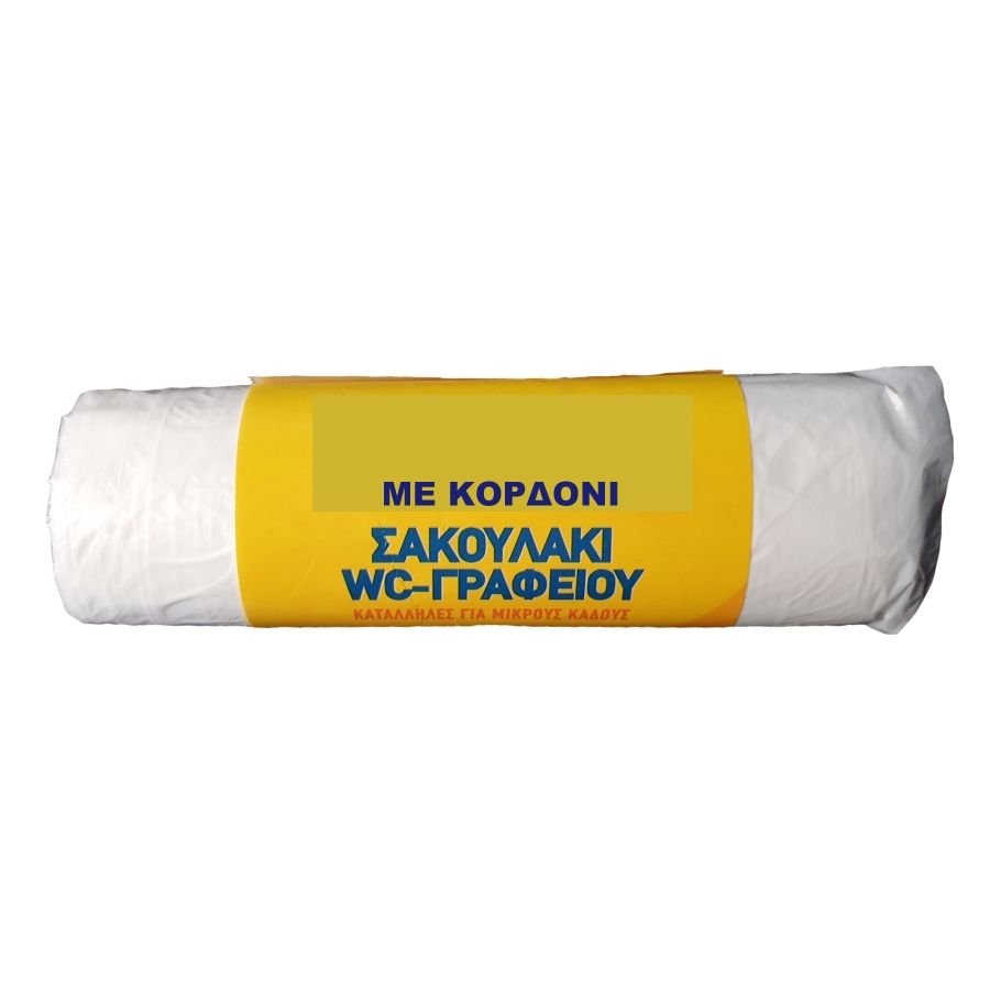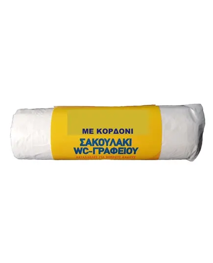 Σακούλες απορριμμάτων ΜΕ ΚΟΡΔΟΝΙ , σε μικρό μέγεθος, κατάλληλες για καλαθάκια απορριμμάτων wc ή γραφείου.
