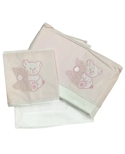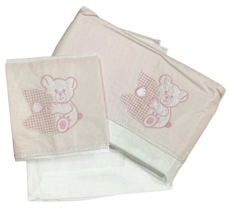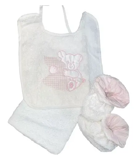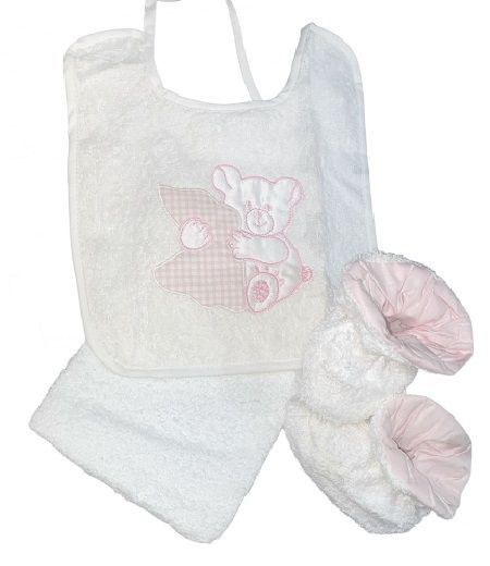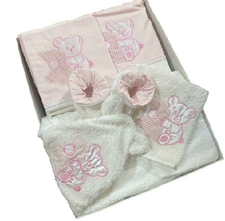 Σετ 8 τεμ. "Βρεφική βαλίτσα κεντητή" σε λευκό-ροζ χρώμα με αρκουδάκι
