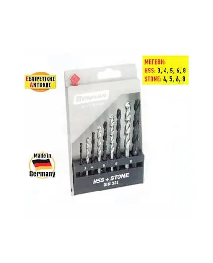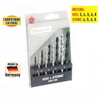 Σετ 9 τεμ διαμαντροτρύπανα σιδήρου HSS + Beton Benman. Μεγέθη HSS: 3, 4, 5, 6, 8 mm, Stone: 4, 5, 6, 8 mm. 74675