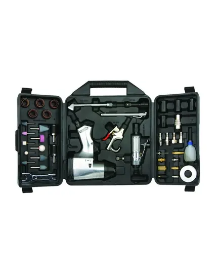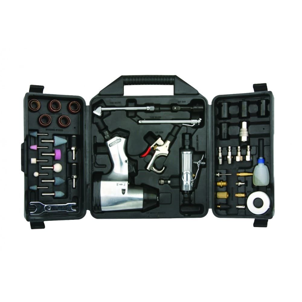 Με βασικά εργαλεία αέρος: 1 αερόκλειδο 1/2” στα 320Nm, έναν αεροτροχό φλέξιμπλ και ένα φυσητήρα, σε συνδυασμό με πολλά εξαρτήματα, διεκπεραιώνει μεγάλο αριθμό εργασιών, στο σπίτι, στο συνεργείο και όπου αλλού χρειαστεί.