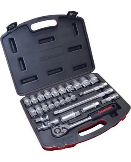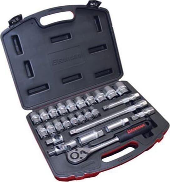 Σετ καρυδάκια 22 τεμαχίων Benman 1/2", από υψηλής ποιότητας σφυρηλατημένο χρωμιοβαναδιούχο χάλυβα (CRV). Αποτελείται από καστάνια αυτόματη 1/2" 72 δόντια (1 τεμ), προεκτάσεις 1/2" (2 τεμ, 125, 250mm), καρυδάκι για μπουζί 1/2" (2 τεμ, 16, 21mm), πολύσπαστο 1/2" (1 τεμ), προσαρμογέας 3/8" θηλυκός - 1/2" αρσενικός (1 τεμ), καρυδάκια 1/2" (15 τεμ, 10, 11, 12, 13, 14, 15, 16, 17, 18, 19, 22, 24, 27, 30, 32mm).