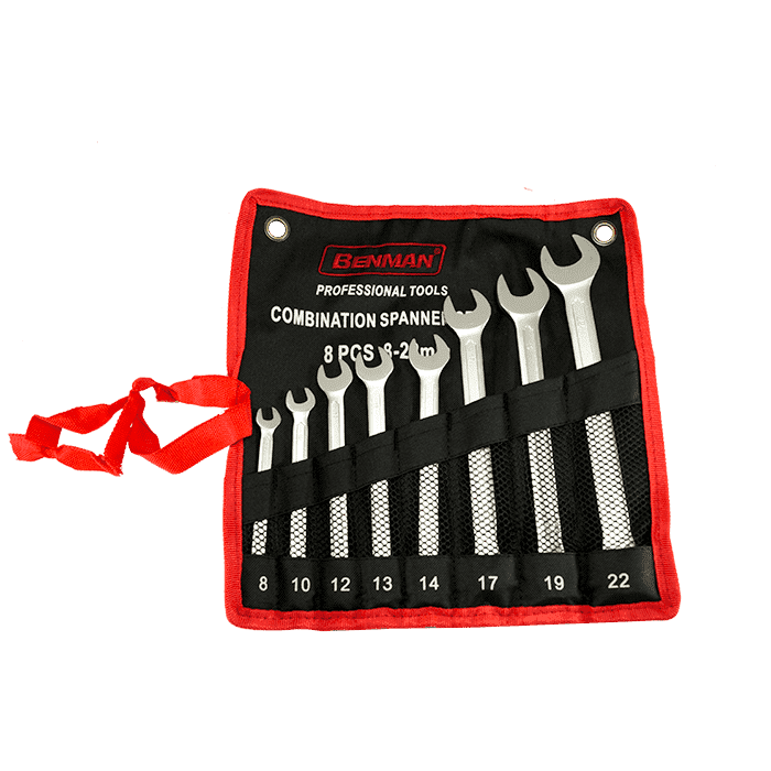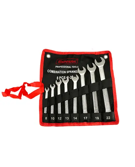Σετ κλειδιά γερμανοπολύγωνα Benman DIN 3113, από υψηλής ποιότητας σφυρηλατημένο χρωμιοβαναδιούχο χάλυβα (CRV), επιχρωμιομένα κεφάλια, με γυαλισμένες κεφαλές και υφασμάτινη θήκη υψηλής ανθεκτικότητας.