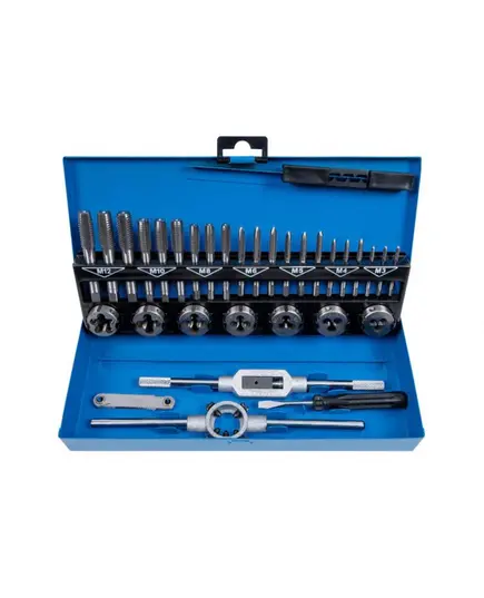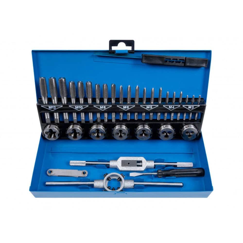 Αυτά τα ατσάλινα εργαλεία είναι πολύ ανθεκτικά. Με αυτό το σετ, μπορείτε να πραγματοποιήσετε ομαλή και με ακρίβεια κοπή σπειρωμάτων. Το σετ αποτελείται από μία μανέλα κολαούζου, μία μανέλα φιλιέρας, ένα κατσαβίδι, ένα σπειρόμετρο, 7 στρόγγυλες φιλιέρες και 21 κολαούζα χειρός