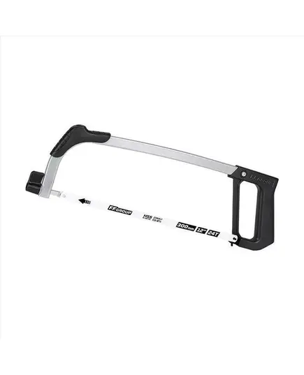 Πριόνι κατάλληλο για κοπή σιδήρου, με τοξοειδές πλαίσιο από στιλβωμένο ατσάλι και λαβή αλουμινίου.