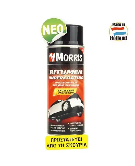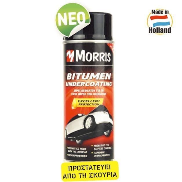 Σπρέυ (σπρέι) ασφάλτου (bitumen undercoating) Morris, για το κάτω μέρος του αυτοκινήτου. Προληπτικό μέσο κατά της σκουριάς. Ηχοαπορροφητικό. Ανθεκτικό στις καιρικές συνθήκες. Παραμένει ευπροσάρμοστο.