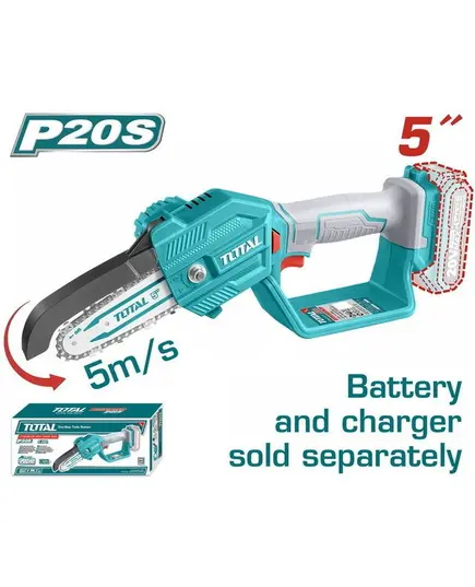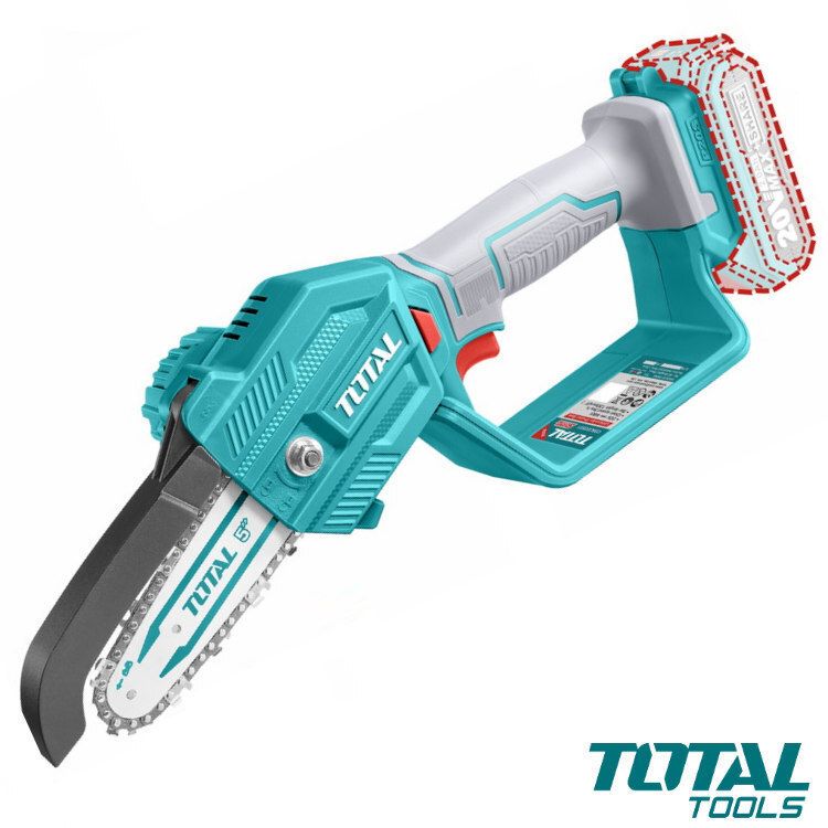 Το αλυσοπρίονο της Total λειτουργεί με μπαταρία 20 volt, δεν παράγει καυσαέρια και μπορείτε να κινηθείτε ελεύθερα καθώς δεν εξαρτάται από καλώδια και πρίζες. Η διάρκεια εργασίας εξαρτάται από την μπαταρία και το πόσο φορτισμένη είναι. Με βάρος 1.66 κιλά και μήκος λάμας 13cm, είναι ιδανικό για κλάδεμα δέντρων και σκάλισμα ξύλων.