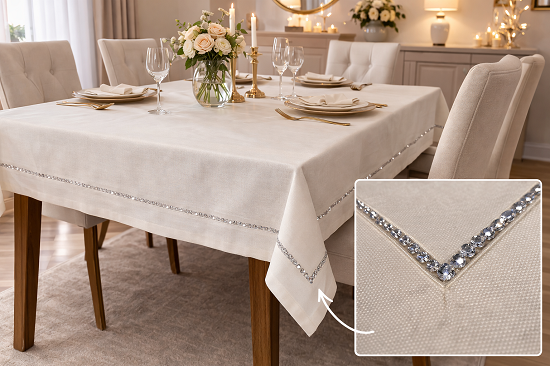Διακοσμήστε την τραπεζαρία σας με το λινό τραπεζομάντιλο με Strass από υποαλλεργικό ύφασμα και απολαύστε το γεύμα σας με τους φίλους ή την οικογένειά σας.